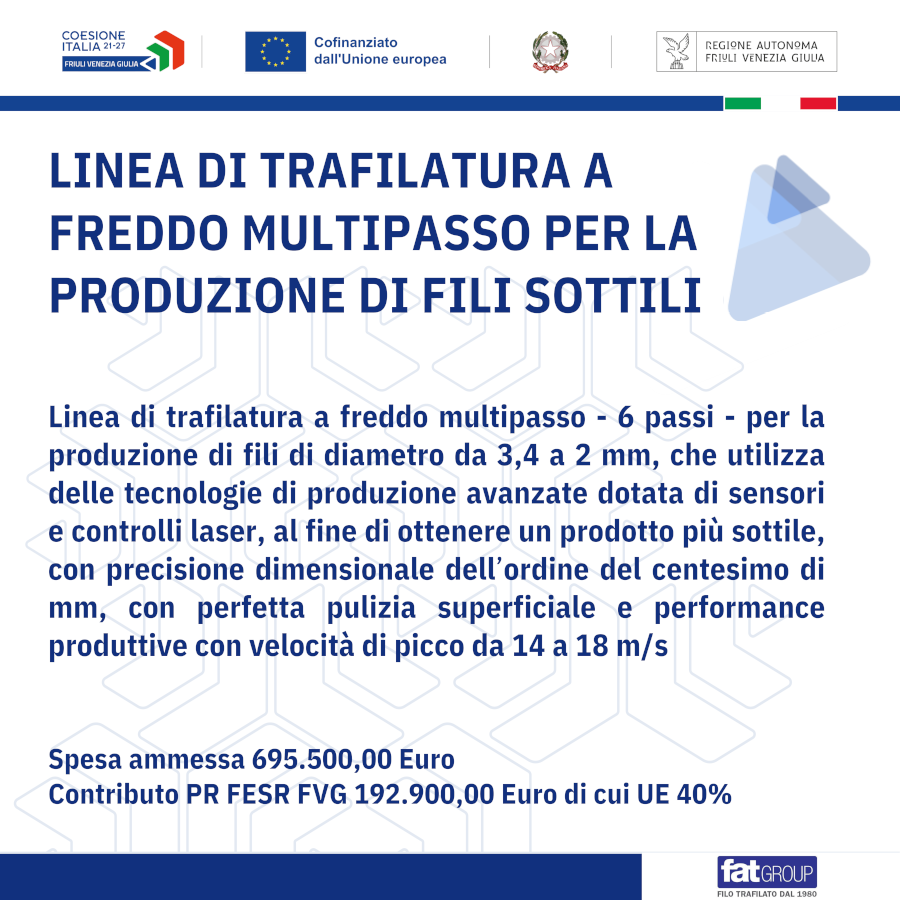 Il progetto prevede un investimento volto alla diversificazione della produzione, per ottenere un filo trafilato lucido mai realizzato precedentemente, attraverso una nuova linea per la trafilatura a freddo, composta da diverse unità di lavoro gestite da apparecchiature elettroniche.